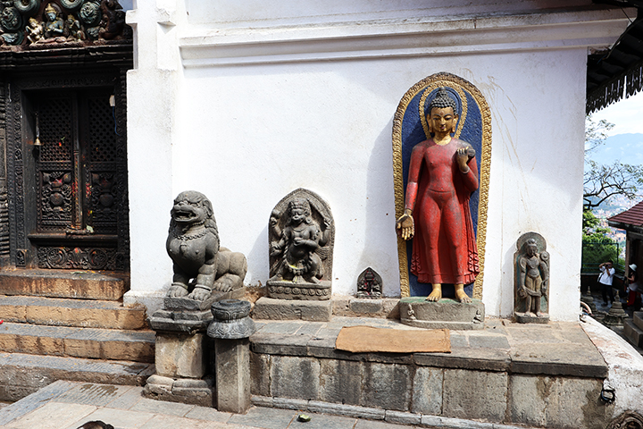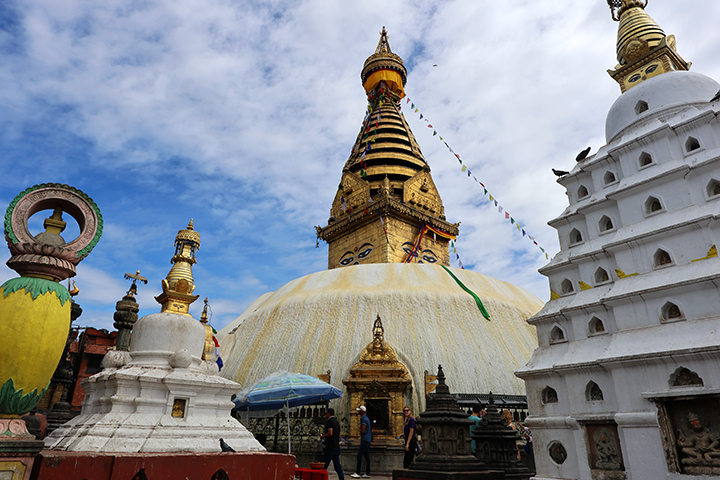 Vigtigst på stedet er selve Swoyambhu-stupaen, der med sit spir af 20 kg guld og Buddhas altseende øjne er et genkendeligt symbol på Nepals hovedstad. Der er flere veje, der fører til toppen af området, hvor stupaen og de øvrige helligdomme står, og Narayan valgte for os den nemmeste, hvor vi kunne undgå alt for mange trapper.