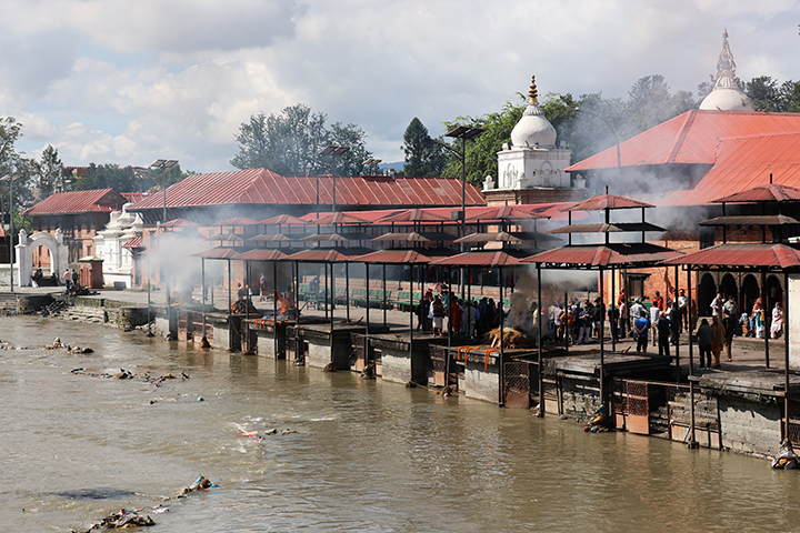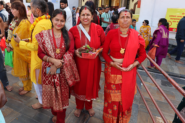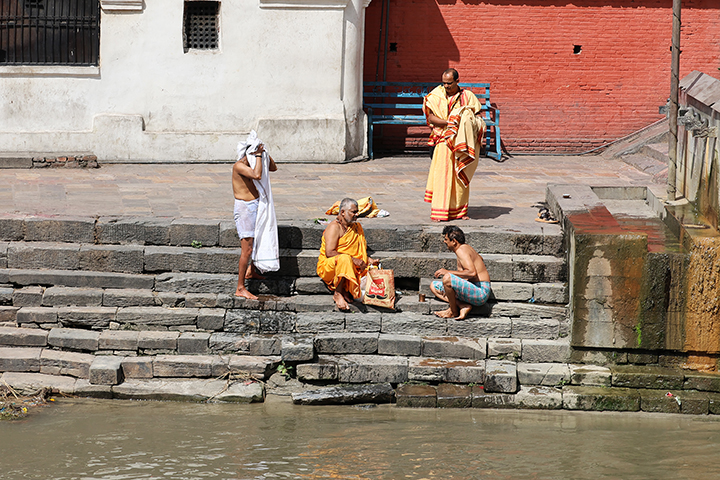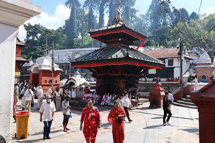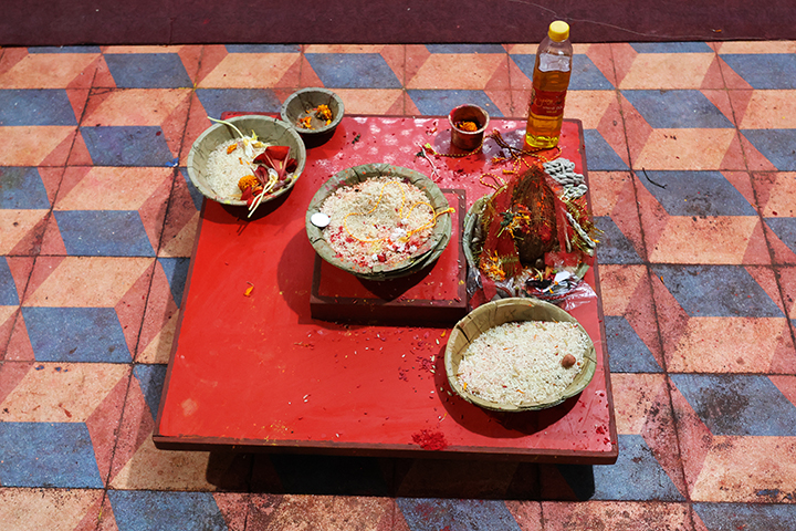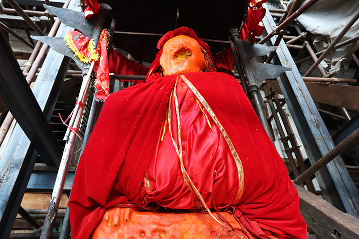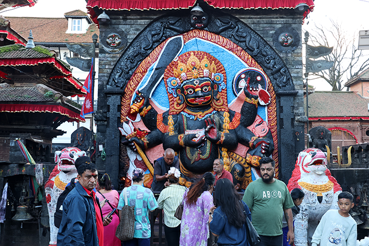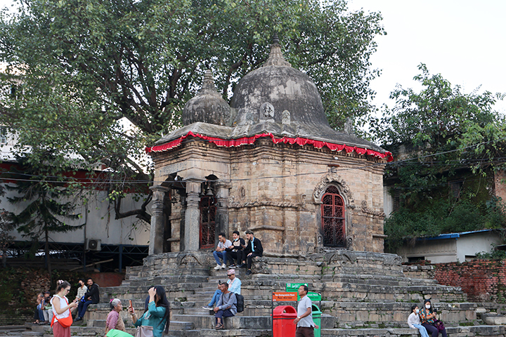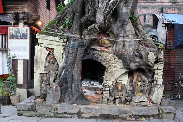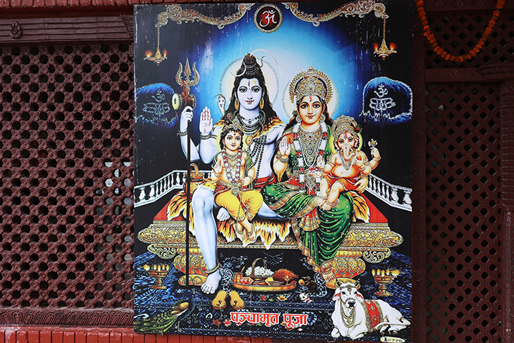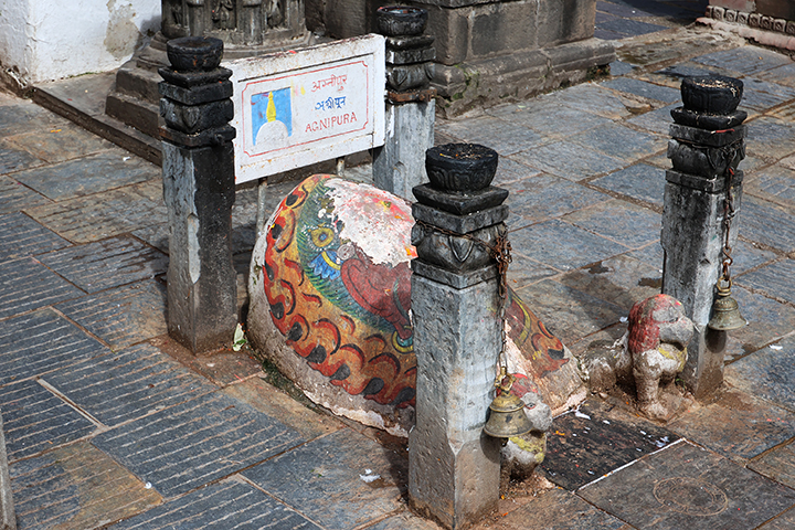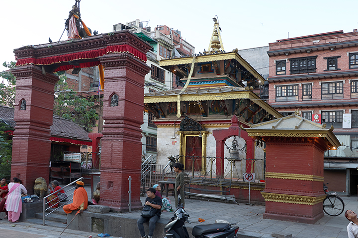 Næste punkt på turen var endnu en plads med en masse stemning – og på vejen derhen faldt vi over en lille helligdom, Agnipur, der er påmalet ildguden Agni Bhairavas røde ansigt med 3 øjne, der repræsenterer solen, månen og ‘den endelige ildstorm’. Farven symboliserer renselse, energi og transformation, og den er forbundet med tilbedelse af ild og energi.