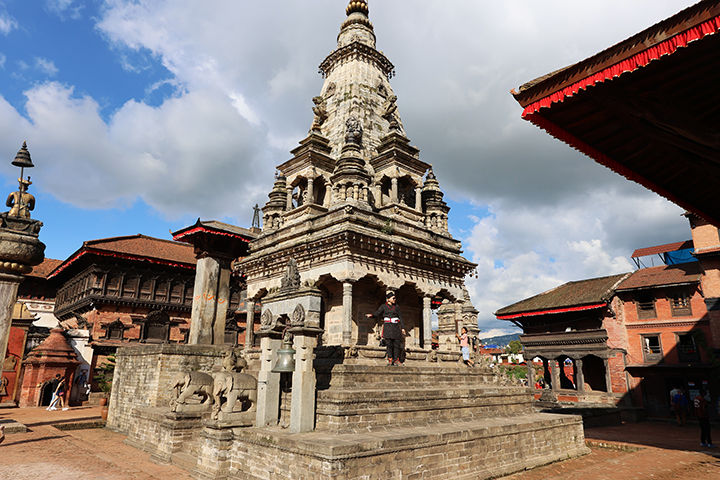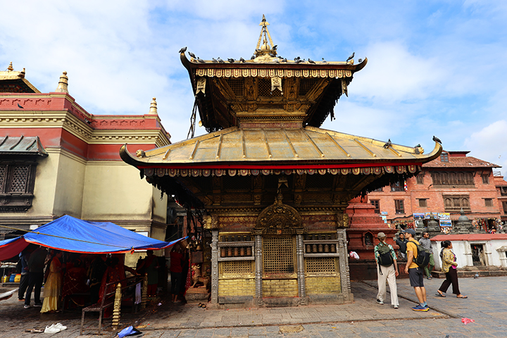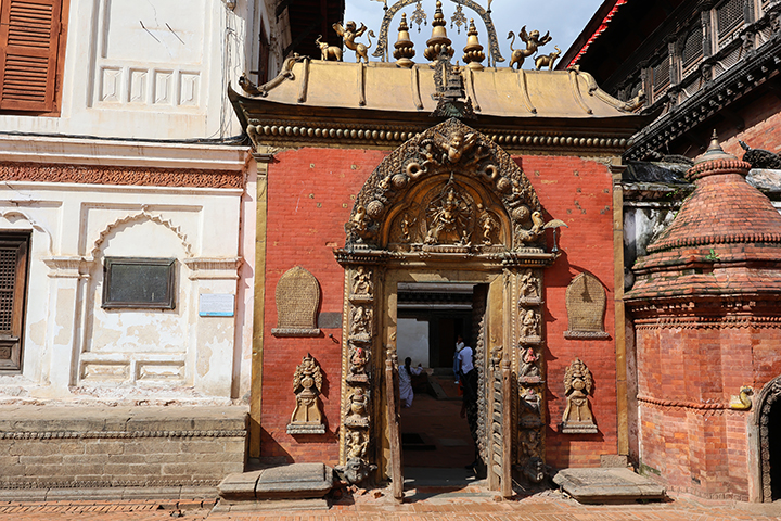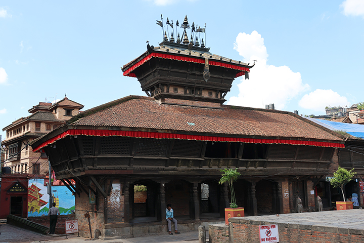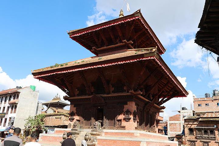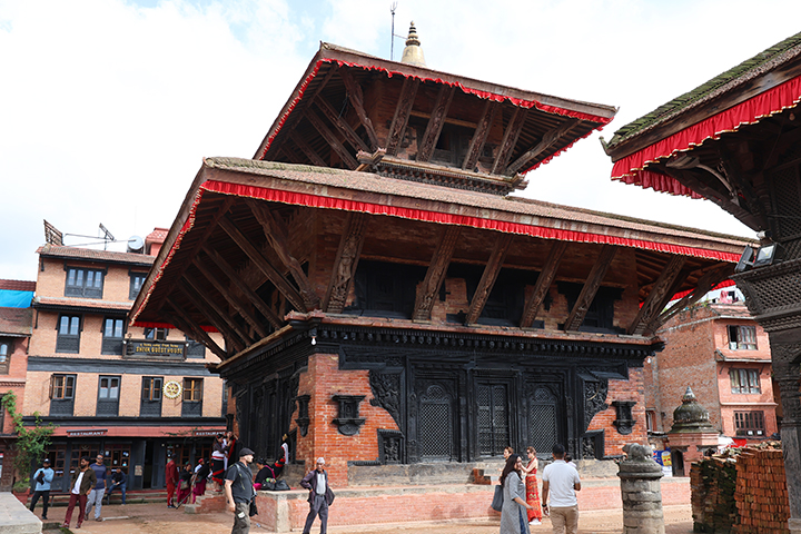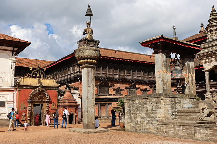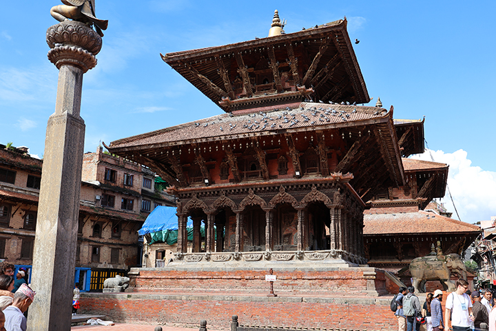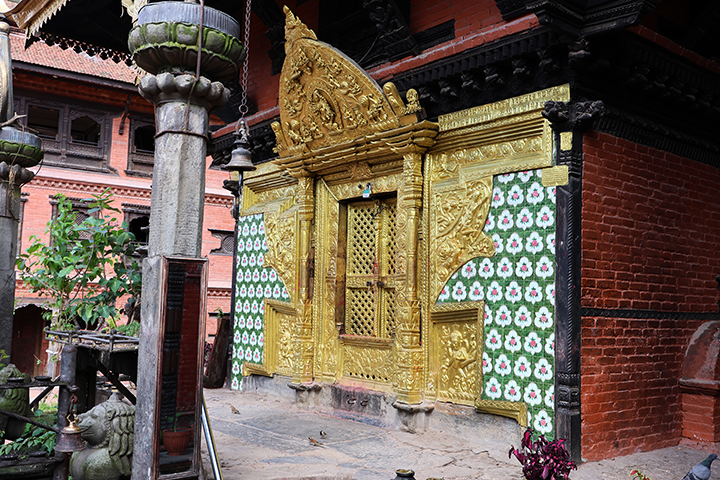 Fra Mul Chowk gik vi igen ud på Durbar-pladsen og nordpå – forbi det flotte Krishna Mandir-tempel. Templet er bygget i 3 etager med 21 gyldne tinder i perioden 1631-37 under kong Siddhi Narsing Malla, og det er resultatet af en drøm, kongen havde haft: at guderne Krishna og Rana stod foran paladset. Herefter beordrede kongen templet bygget på dette sted.