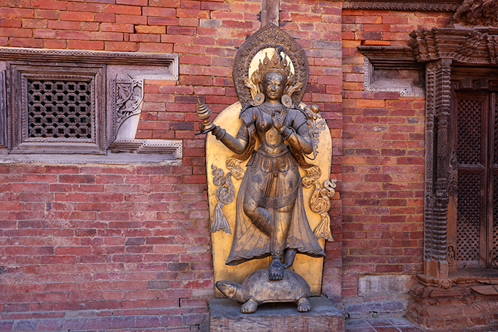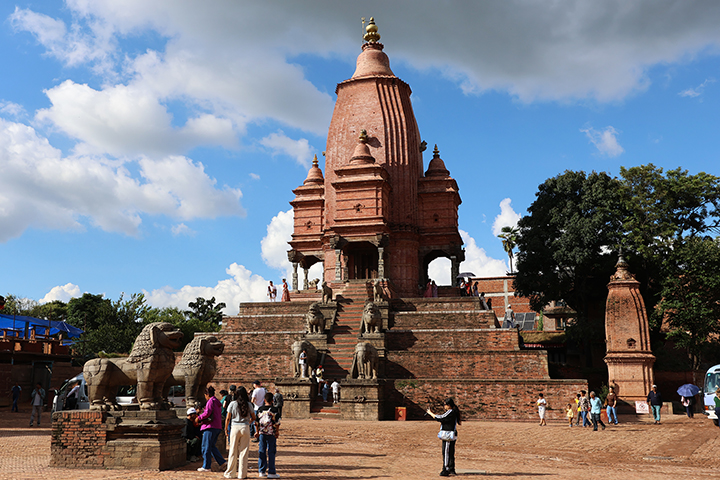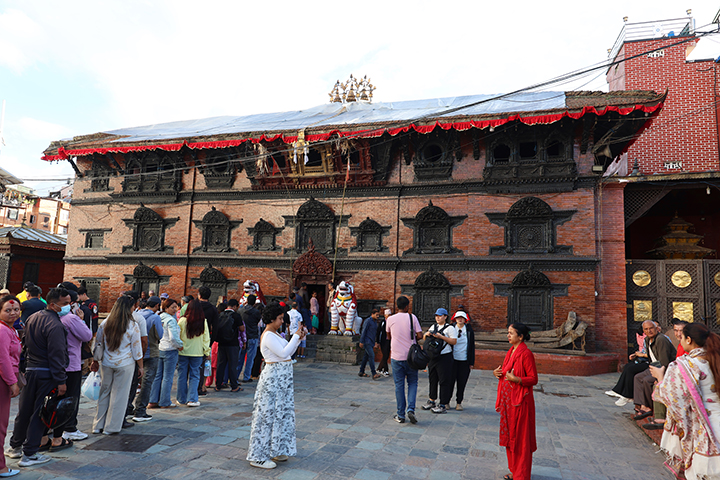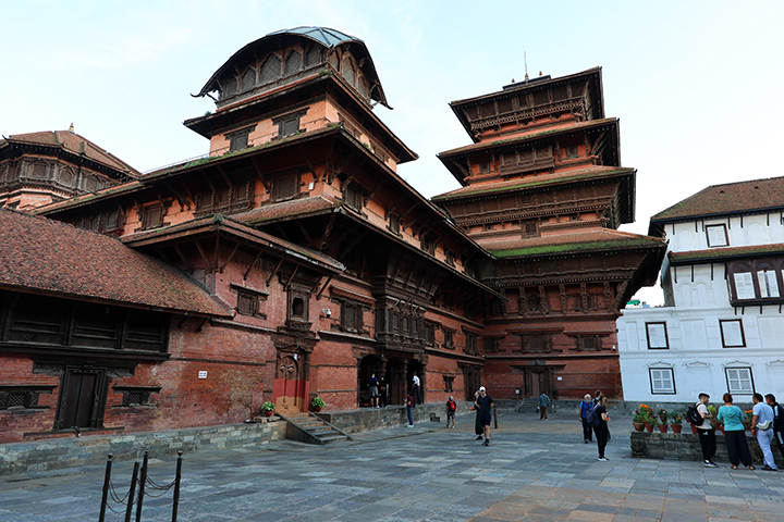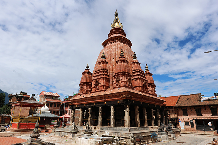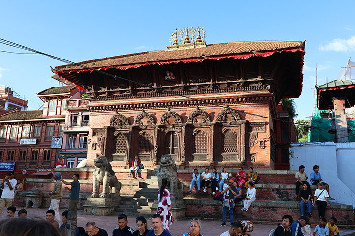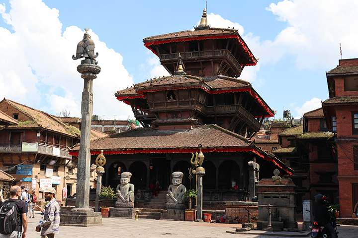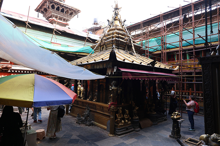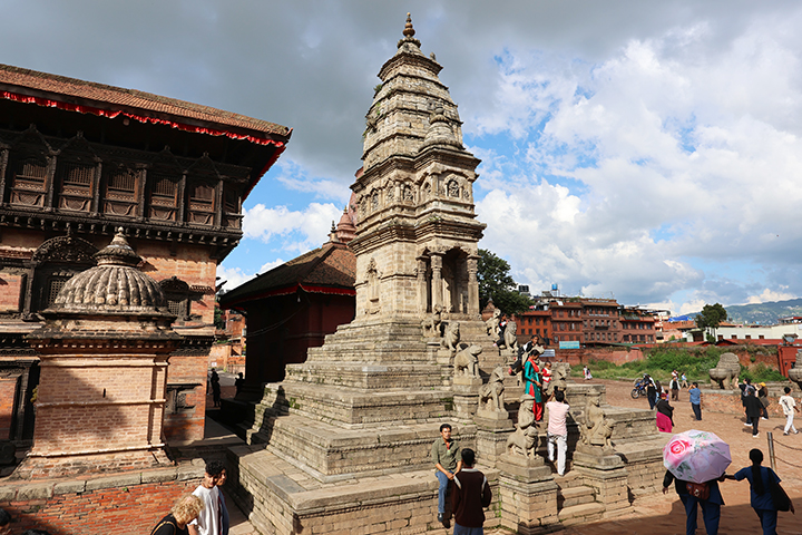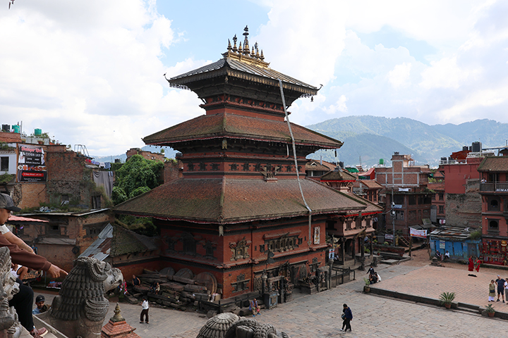 Fra Mul Chowk gik vi igen ud på Durbar-pladsen og nordpå – forbi det flotte Krishna Mandir-tempel. Templet er bygget i 3 etager med 21 gyldne tinder i perioden 1631-37 under kong Siddhi Narsing Malla, og det er resultatet af en drøm, kongen havde haft: at guderne Krishna og Rana stod foran paladset. Herefter beordrede kongen templet bygget på dette sted.