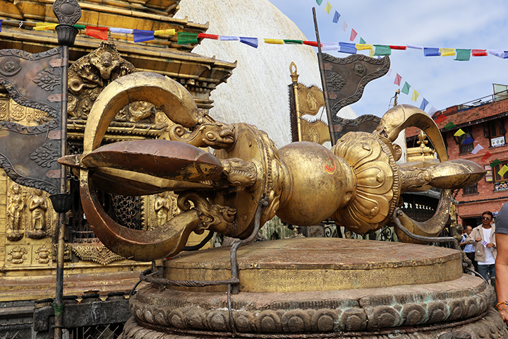 Fra den nordlige plads fortsatte vi – stadigvæk med uret rundt om Swoyambhu-stupaen – til trappen fra øst op til tempelområdet, og her kunne vi beundre den meget store, gyldne Vajra, en slags scepter, der er placeret på en rund base af sten med 12 dyr, der repræsenterer astronomiske symboler. Vajraen repræsenterer visdom og medfølelse i Vajrayana-buddhismen, hvor den tilbedes, og hvor de troende bærer vejraer som ringe og medaljoner til beskyttelse mod onde kræfter.