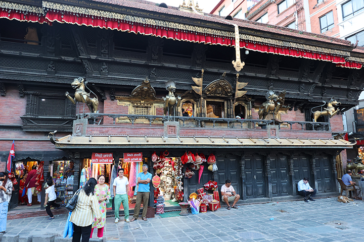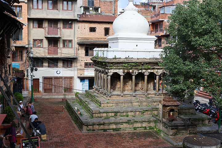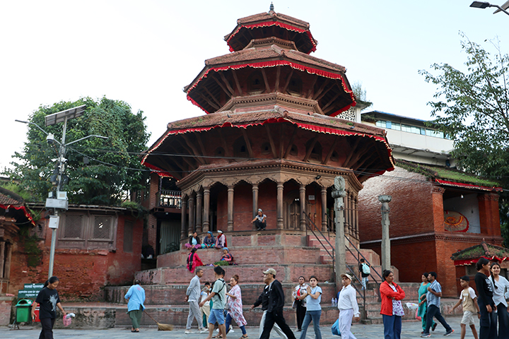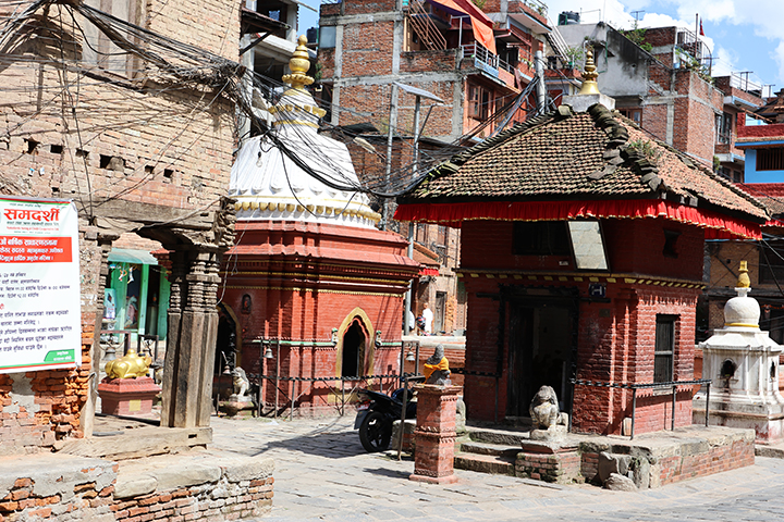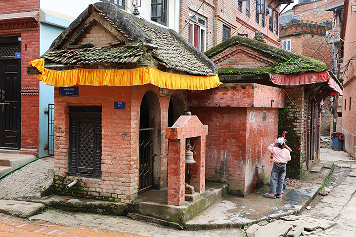 Vores tur bragte os forbi mange små hindutempler i gaderne, og flere steder var der også små pavilloner, hvor folk hang ud. Byggestilen var meget traditionel Newar-stil med røde mursten og træ med masser af udskæringer i bjælker, døre og vinduer.