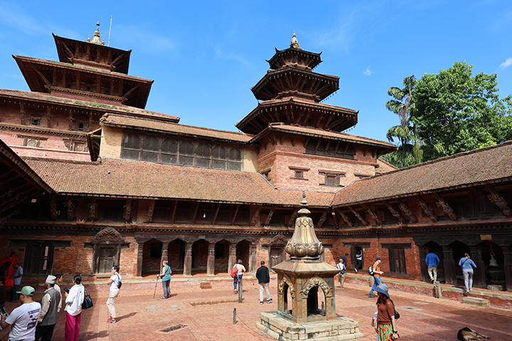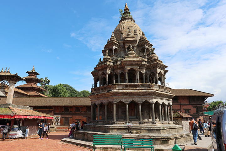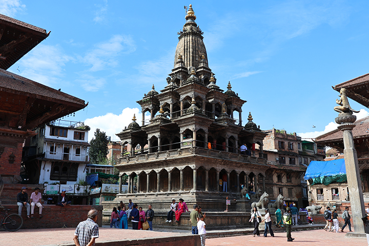 Fra Khokana vendte bilen, og vi kørte nordpå til dagens sidste stop, Patan, der er en af de tre kongebyer i og omkring Kathmandu. Vi blev sat af ved Chyasim Deval Krishna-templet, der ligger i den sydligste del af Patans historiske område, Durbar-pladsen, der er UNESCO Verdensarv.
