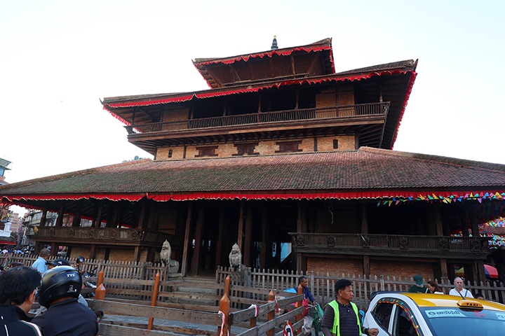 Ellers endte vi efter nogen tid på en større åben plads, der var domineret af det flotte Rato Machhindranath-tempel, der er et vigtigt pilgrimssted for både hinduer, der ser Rato Machhindranath for at være en reinkarnation af Lord Shiva, og buddhister, for hvem han er en reinkarnation af Avalokiteshvara.