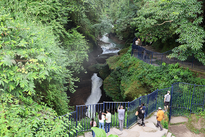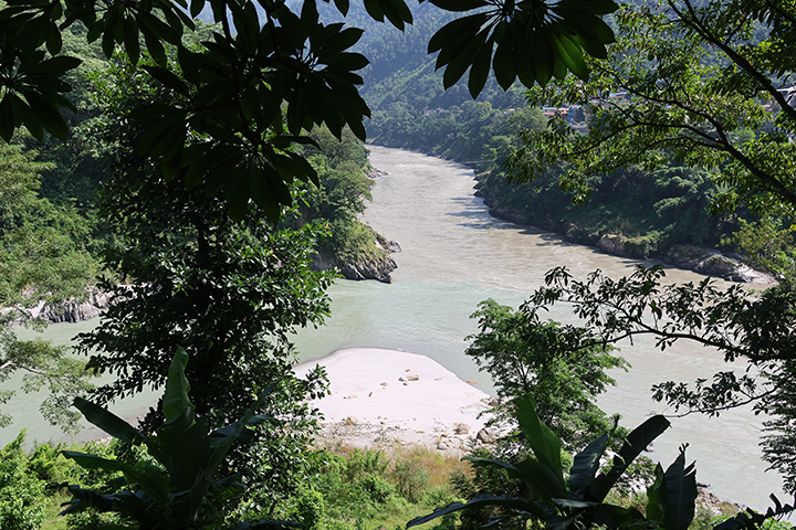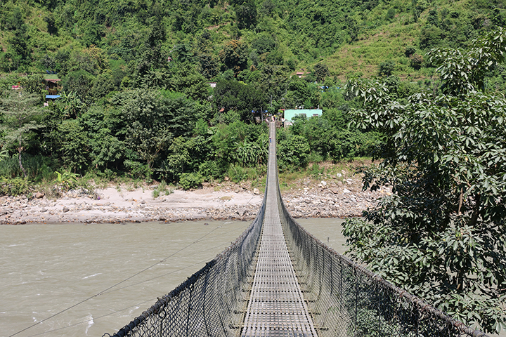 På vejen stoppede vi ved en hængebro, som vi fik lejlighed til at vandre på, og næsten alle vovede sig over den mere end hundrede meter lange bro, der spændte over Trishuli-floden. En lidt kildrende fornemmelse for os, der ikke var vant til det!