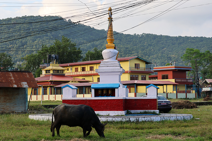Dette bragte os forbi flere interessante steder og bygninger. Vi valgte at gå mod venstre, så vi gik med uret rundt om stupaen, hvilket man jo skal gøre i følge buddhistisk tro, og det førte til en mindre plads vest for stupaen, hvor vi både kunne se det tibetanske buddhist-kloster Deva Dharma Maha Vihar (vest for pladsen) og ikke mindst det lille, flotte Harati Ajima tempel.