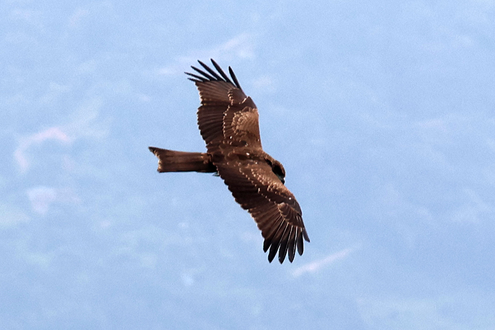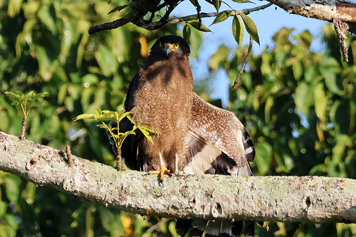 Ad en lille sidevej kørte vi nu ud i et smukt landskab, hvor vi i et træ fik øje på et flot eksemplar af en toppet slangeørn (Spilornis cheela), der sad og spejdede efter føde på jorden. Slangeørnen lever af slanger, firben og andre krybdyr, som den finder i spredte skovområder tæt på vådområder.