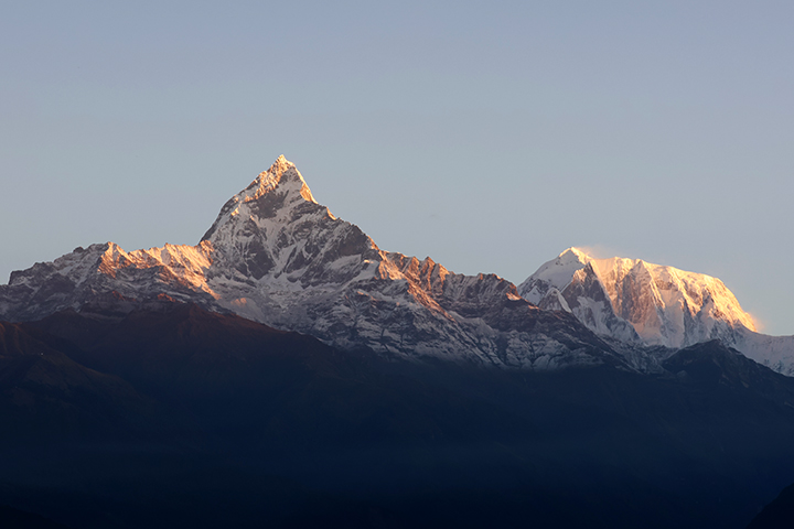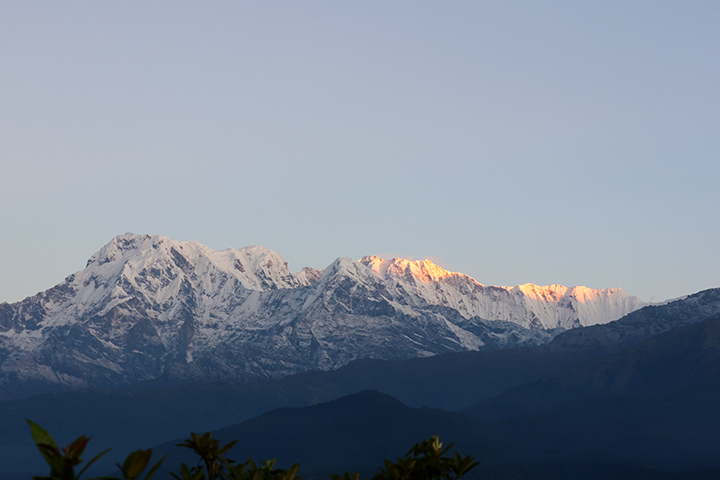 Efter en sidste kort nat på vores resort i Sauraha skulle vi på en morgensafari – ikke i selve nationalparken, men i en privat park, der grænser op til denne, og allerede inden, parken havde åbnet sine porte for besøgende, holdt vi klar som nogen af de første ved indkørslen til parken. Her kunne vi så – endnu engang – se dagens første sol over Annapurna-massivet, på noget større afstand end tidligere.