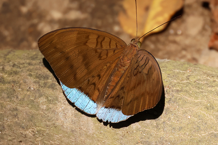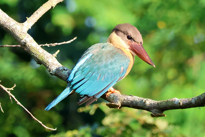 På den videre rundtur traf vi nu først på en enkelt han-påfugl i sin flotte, skinnende fjerdragt og derefter en storkenæbbet isfugl (Pelargopsis capensis), der sad i et træ, der ragede ud over en mindre sø – sikkert spejdende efter fisk i vandet. Storkenæbisfuglen er en meget stor isfugl med stort, rødt næb og grøn ryg, blå vinger og brunt hoved og gulbrun hals og bug. Og den gjorde sig rigtig til, da den sad her højt til vejrs i solskinnet.