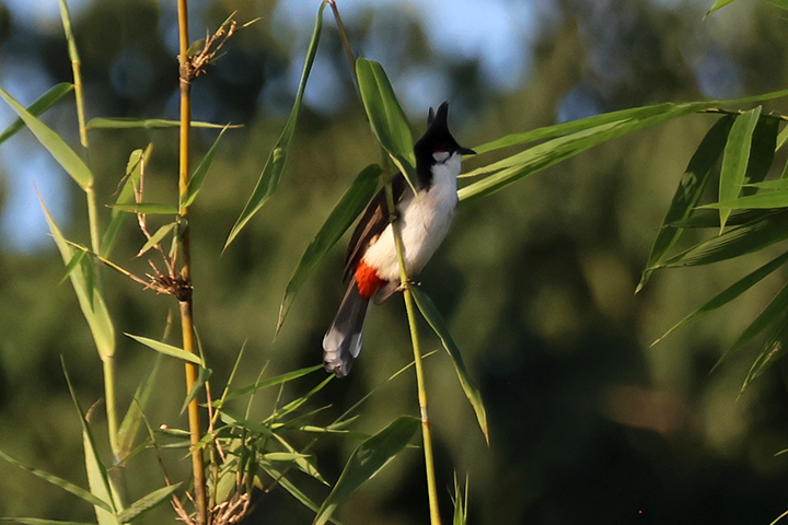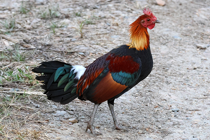 Nu var tiden noget fremskreden, og vi bevægede os derfor hastigt tilbage mod stedet, hvor vi skulle passere Rapti-floden; kun afbrudt af en flot bankivahane (Gallus gallus), der absolut skulle spankulere over vejen lige foran jeepen. Bankivahønen, der også kaldes rød junglehøne, anses sammen med den grå junglehøne for at være stamfaderen til de moderne tamhønseracer, vi kender i dag.