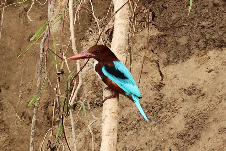Næste interessante dyr var flere eksemplarer af hvidstrubede isfugle (Halcyon smyrnensis), der sad i grenene langs flodens bredder, især hvor de var stejle og ufremkommelige. Denne isfugl, der også af og til kaldes smyrnaisfugl, er ret stor med klar blå ryg, vinger og hale, mens hovedet og det nederste af maven er kastaniebrune og brystet hvidt. En imponerende og flot isfugl, der tiltrækker sig en vis opmærksomhed med sin farvestrålende fjerpragt.