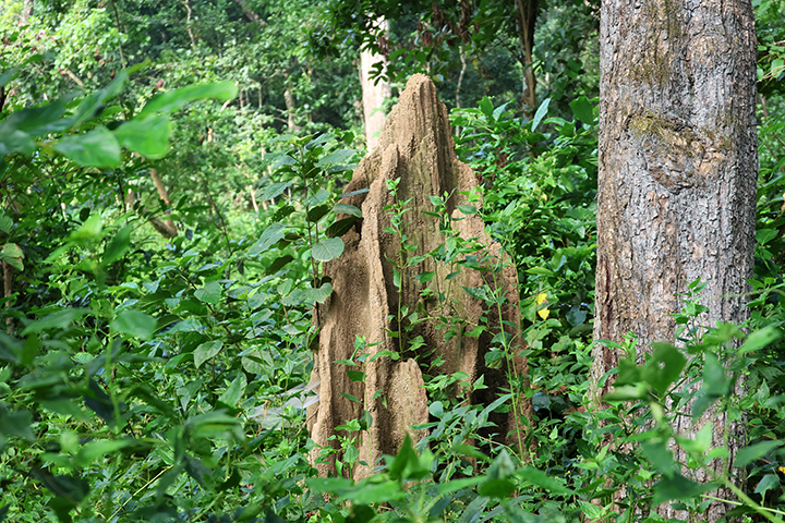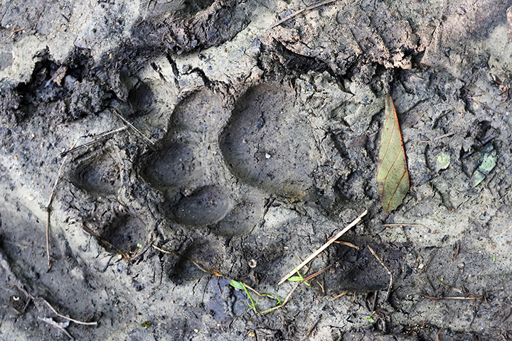 Sådan skulle det nu ikke gå – om end vi så både kradsemærker på træerne af tigerens kløer og friske aftryk af dens poter i den våde jord – så den måtte jo have været i området. Det eneste, vi så af tegn på levende væsener, var større edderkopper i deres spind og flere termitboer, der i øvrigt var mange steder i landskabet.