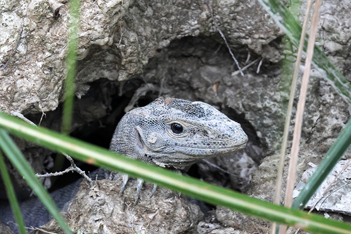 Vi kørte i lang tid uden at se andet end nogle småflokke af spotted deer, der på dansk har navnet Chital-hjort (Axis axis) – desværre på lang afstand eller godt skjult mellem træerne og anden bevoksning. Ellers gjorde vi et enkelt holdt ved et hul under en trærod, der skjulte en varan, og selv om kun hovedet var synligt, var der med stor sandsynlighed tale om en bengalsk varan (Varanus bengalensis). Denne varan er den mest almindelige i nationalparken, men er ret sky og undgår mennesker. Hvordan vores guide fik øje på den, vides ikke… Måske var den altid i dette hul?