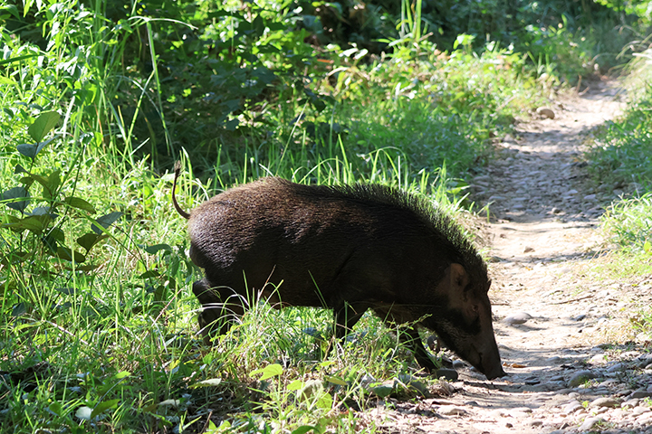 Mens vi holdt stille her og betragtede slangehalsfuglen, dukkede der et indisk vildsvin (Sus scrofa cristatus) frem fra græsset ved siden af grusvejen – for at krydse over på den anden side.