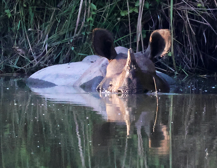 Nu, hvor vi endelig havde fået øje på et pansernæsehorn, gik det stærkt, og vi havde således ikke kørt mange hundrede meter mere, før vi fik øje på endnu et næsehorn, der denne gang lå og rodede rundt i et vandhul – næsten helt under vand og flydende rundt mellem vandhyacinter.