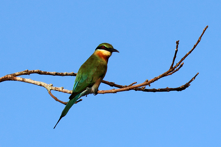 Nu var det imidlertid blevet tid til at søge tilbage til Sauraha, så vores chauffør satte bilen i bevægelse for at komme tilbage til floden – i det samme øjeblik, som han fik øje på en blåhalet biæder (Merops philippinus), der sad på en gren i et udgået træ – højt oppe i luften. Den blåhalede biæder lever af insekter som bier, hvepse, gedehamse og nok også guldsmede, og -som det er tilfældet med alle de andre biædere – er der tale om en farvestrålende fugl!