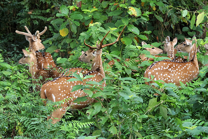 Herefter kørte vi gennem lidt skov, hvor vi flere gange stødte på chital-hjorte (Axis axis), både individer, der vandrede på vejen foran os, og småflokke i bevoksningen langs vejen. Chital-hjorten er den mest almindelige hjorteart i Chitwan, og den kendes let på den lysebrune pels med hvide pletter – deraf det engelske navn ‘spotted deer’.