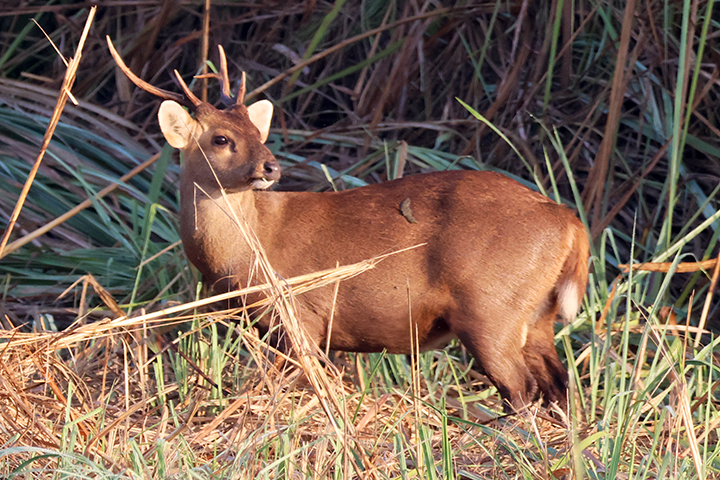 Efter lidt tid kørte vi dog videre i det åbne land, hvor vi ud over endnu flere chital-hjorte pludselig fik øje på en mindre flok småhjorte, der viste sig at være sydlig rød muntjac, som vi i øvrigt lærte at kende under dens engelske navn, barking deer (Muntiacus muntiak). Flokken bestod af en enkelt han med flere hunner omkring sig. Den sydlige røde muntjac, der er meget sky og har et hundeagtigt kald, der minder en hunds gøen, er den mindste hjort, der lever i Chitwan, og den ses faktisk ikke så ofte, da den falder i med omgivelserne.