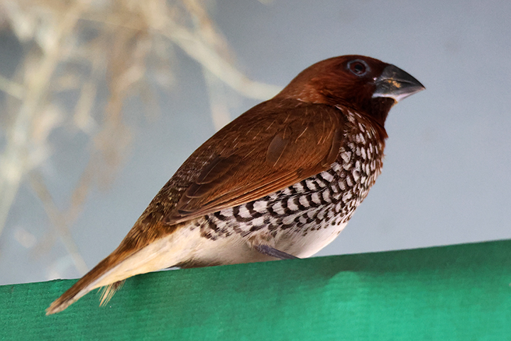 Efter denne rovfugleoplevelse kørte vi videre til parkens besøgscenter, hvor et par musketfinker (Lonchura punctulata) havde bygget rede blandt de forklarende tavler.