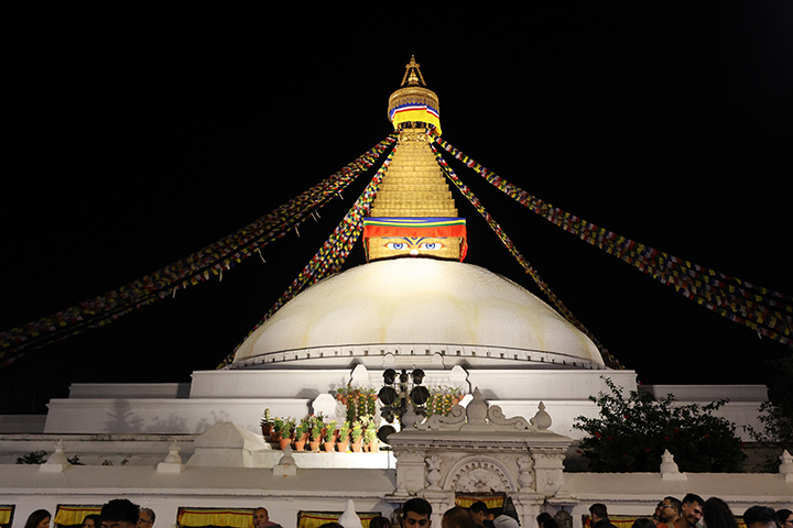 Vi ankom til stupaen efter mørkets frembud, og sammen med utallige andre – turister som pilgrimme – vandrede vi med uret rundt om stupaen og iagttog livet. Den nuværende stupa på stedet er formodentlig opført i 1300-tallet, men bygget på fundamentet af en tidligere stupa fra ca. år 600, der opførtes under den tibetanske kong Songtsen Gambo, da han konverterede til buddhismen. Sikkert er det, at stupaen blev alvorligt beskadiget ved jordskælvet i 2015, hvor den slog revner i spiret, men allerede i halvandet år senere var den restaureret, finansieret af private donationer, og den var således den første af alle jordskælvsramte verdensarvssteder i Kathmandu-dalen, der blev genopbygget.