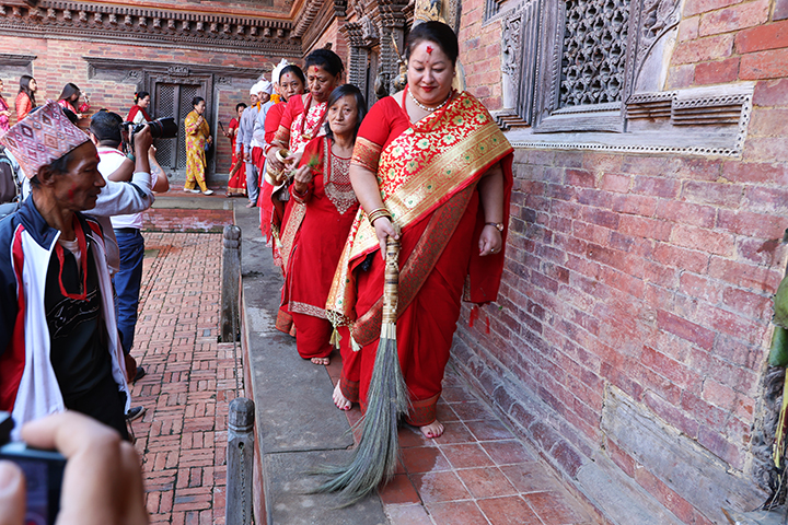 Og så var vi rigtig heldige med timingen: Netop som vi ankom, satte et rituelt optog i gang fra gårdspladsens ene hjørne, og en broget flok af mennesker, kvinder med koste, rituelle genstande eller bærende på børn og mænd med bla. gudinden Taleju iført blomsterkranse af tagetes, bevægede sig langs gårdens mure og ud på Durbar-pladsen, mens vi så på.