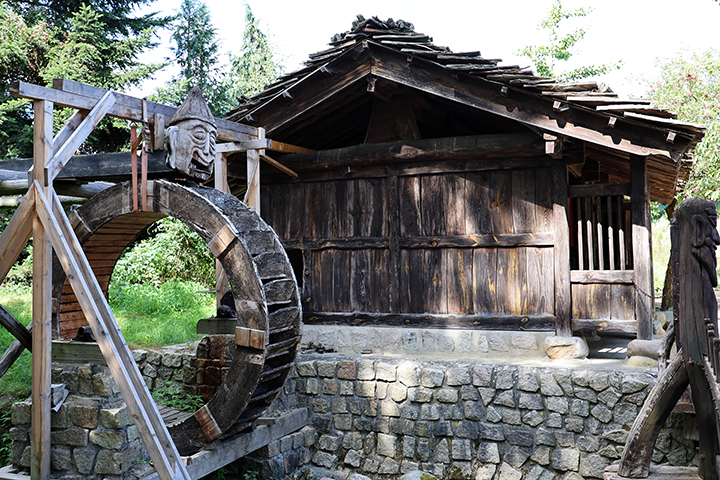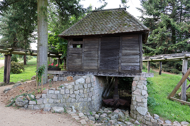 Fra stolpemøllen bevægede vi os videre til et dybereliggende område i museumsparken, hvor der var blevet plads til vandmøller fra forskellige dele af verden – repræsenterende forskellige teknikker. Møllerne var fra Tyrol, Serbien og Korea.