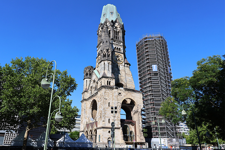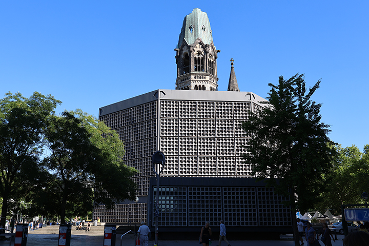 I stedet fortsatte vi til Breitscheidplatz, der er kendt for Gedächtniskirche, der i dag er et vartegn i det vestlige Berlin. Den oprindelige kirke på stedet blev bygget i perioden fra 1891 til 1895, men den blev slemt beskadiget under et bombeangreb natten til den 23. oktober, 1943; et angreb som kun en rest af spiret, en stor del af indgangshallen samt alteret og dåbskapellet overlevede.