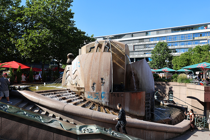Vi fortsatte vores vandretur østpå ad Kurfürstendamm, forbi Weltkugelbrunnen, der er et springvand i rød granit, der viser en symbolsk globus med figurer fra forskellige kulturer afbildet. Springvandet er indviet i 1983.