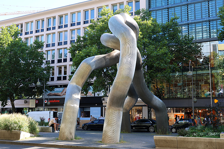 Fra springvandet gik vi ned ad Tauentzienstrasse og forbi skulpturen Berlin, der består af 4 stålrør, der rækker opad og mødes i en løkke uden at røre hinanden – hvilket symboliserer nærheden, isolationen og de afbrudte forbindelser mellem Vest- og Østberlin.