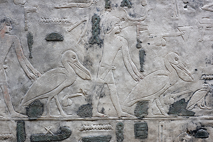 På vores videre færd gennem udstillingen kom vi til en sal, hvor det var større elementer med relieffer, der var udstillet, bla. en relief, der viste opdræt af pelikaner og fremstilling af både af papyrus. Denne relief daterer sig til ca. 2430 f.Kr.